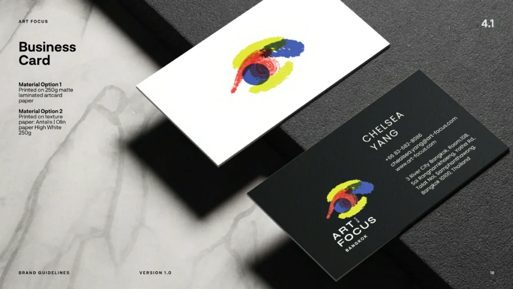 Art Focus Bangkok’s brand visual design is rooted in artistic expression, using a bold brush-stroke identity as its defining visual language. Fluid, hand-drawn strokes convey movement, creativity, and the raw energy of contemporary art, while a colorful palette brings vibrancy and emotional depth to the brand. The recurring eye shape acts as a symbolic motif—representing perspective, observation, and focus—reinforcing the gallery’s role as a place to see, question, and engage with art. Combined with clean typography and flexible graphic applications, the visual system balances expressive freedom with curatorial clarity. The result is a distinctive, art-led identity that feels dynamic, contemporary, and deeply connected to Bangkok’s creative scene.