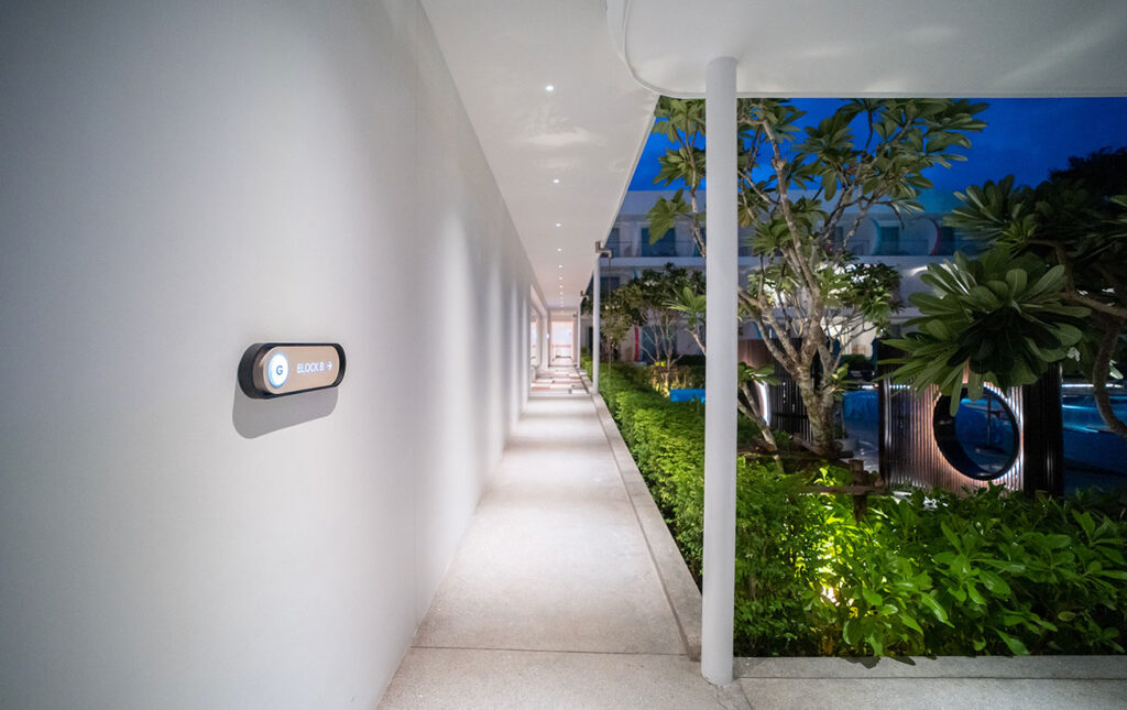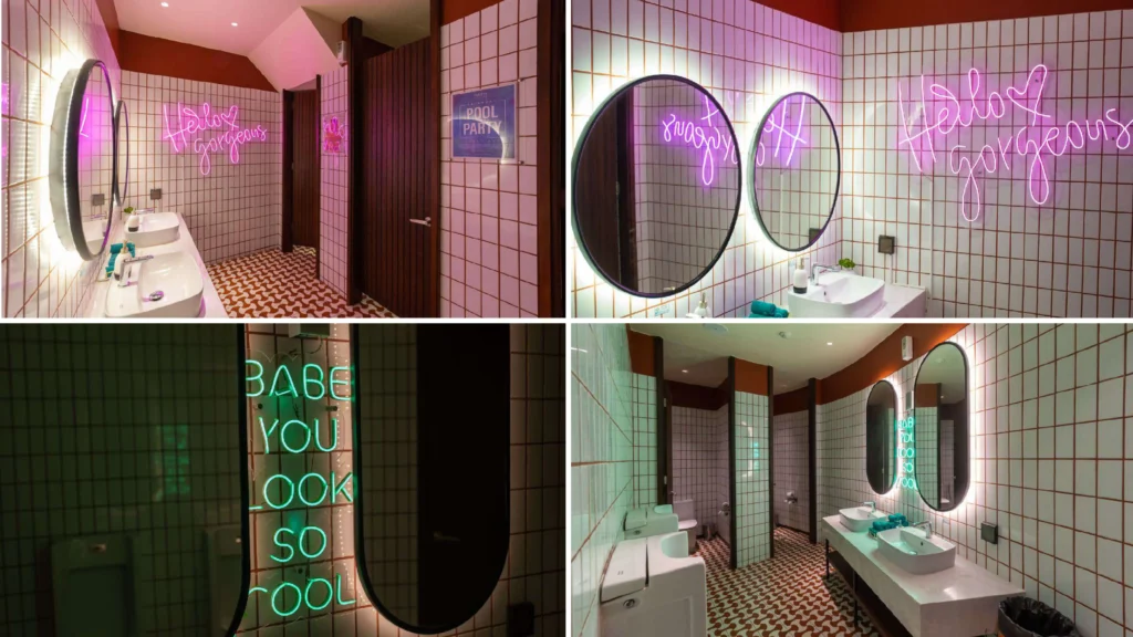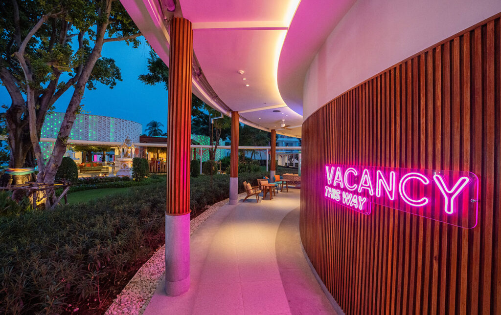 Neon signage energizes the hotel’s atmosphere, infusing contemporary flair with mid-century retro character. Both directional and expressive, the signage acts as a playful guide while referencing the spirit of Motel Revivalism. This approach reflects Whitespace’s focus on creating memorable, mood-driven guest experiences through thoughtful detail. Clean compositions and a minimalist framework allow the neon elements to stand out without overwhelming the space, seamlessly integrating them into the overall signage system. The result is a vibrant visual language that celebrates nostalgia, movement, and modern hospitality design.
